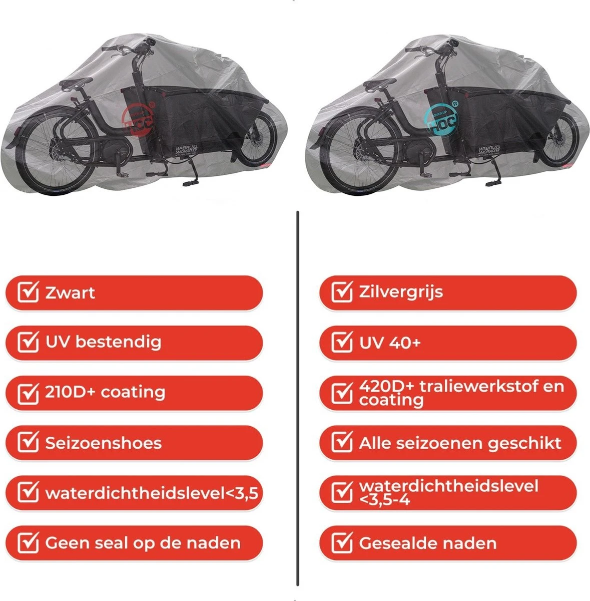 Let op: Al onze hoezen worden met de hand vervaardigd. Het verschil van onze hoezen ligt hem dan ook in de kwaliteit van de stof. Deze Redlabel hoes is een hoes van een wat mindere kwaliteit als die van onze Diamond Variant. En daardoor is deze hoes minder duurzaam. Bedenk dan ook goed wanneer en waarvoor u de bakfietshoes wilt gebruiken (alleen voor een seizoen of voor het hele jaar?). Net als met banden voor een auto is het verstandig om even na te gaan voor welk seizoen u hem aanschaft!