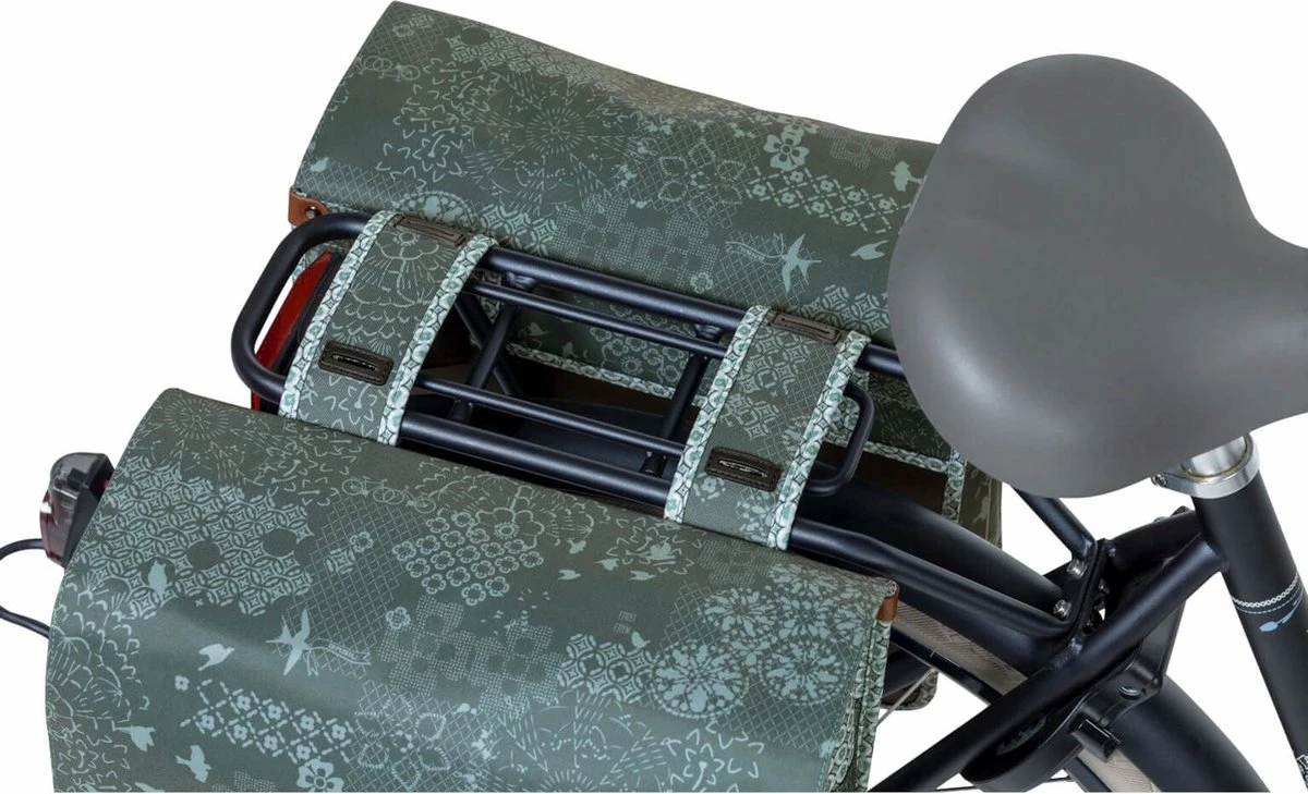 De Basil Bohème dubbele fietstas is een rode dubbele fietstas met een stijlvolle bohemien print. De tas heeft een inhoud van 35 liter waardoor je er meer dan genoeg boodschappen, sportspullen en andere benodigdheden in kwijt kan. Een fietsrit naar de supermarkt of een fietstrip met vriendinnen, deze fietstas maakt jouw fietsrit makkelijker en leuker. De fietstas is geschikt voor vele bagagedragers (ook e-bikes) en beschikt over een stevige binnenvoering en kunstlederen details. Verder is de tas afsluitbaar met behulp van een aansnoerkoord en verstelbare kliksluitingen. Gaat het onderweg regenen? Dan zorgt het waterafstotende polyester ervoor dat de inhoud van de tas droog blijft. De reflectiedetails op beide kanten zorgen ervoor dat je beter zichtbaar bent in het donker. Dankzij het Universal Bridge systeem bevestig je de tas eenvoudig op je bagagedrager. Ook op de bagagedrager van je elektrische fiets. Het Universal Bridge systeem bestaat uit vier gleuven. Deze gleuven maken het mogelijk om de tas op twee manieren te bevestigen: • Vaste montage: met behulp van de meegeleverde riempjes. • Afneembaar: in combinatie met een adapterplaat. Geschikt voor adapterplaten van MIK en Racktime platen. Deze adapterplaten dien je apart aan te schaffen. Eigenschappen: De fietstas is geschikt voor diverse bagagedragers (ook e-bikes). De tas kan door het waterafstotende polyster tegen een regenbuitje, maar zal na een hele dag in de regen niet meer kurkdroog zijn. De reflectiestukken maken je beter zichtbaar in het donker.