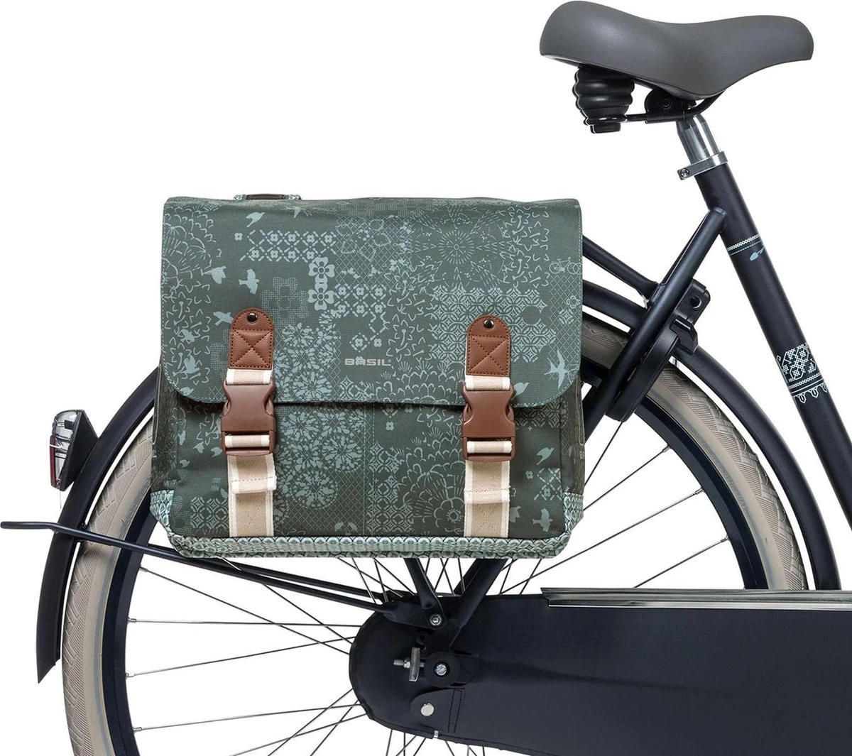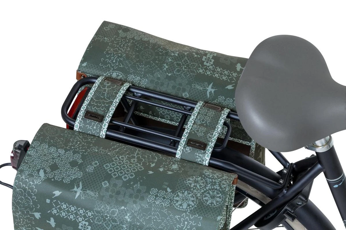 De Basil Bohè;me Double Bag is een dubbele groene fietstas met een stijlvolle bohemien print. Een fietsrit naar de supermarkt of een fietstrip met vriendinnen, deze fietstas maakt jouw fietsrit makkelijker en leuker. De groene tas heeft een inhoud van 35 liter waardoor je er meer dan genoeg boodschappen, sportspullen en andere benodigdheden in kwijt kan. De fietstas is geschikt voor diverse bagagedragers (ook e-bikes) en beschikt over stevige binnenvoering en kunstlederen details. Met behulp van het aansnoerkoord en de verstelbare kliksluitingen sluit de tas. Door het waterafstotende polyester blijft de inhoud van de tas droog bij een kleine regenbui. De reflectiedetails op beide kanten zorgen ervoor dat je beter zichtbaar bent in het donker. Dankzij het Universal Bridge systeem bevestig je de tas eenvoudig op je bagagedrager. Ook op de bagagedrager van je elektrische fiets. Het Universal Bridge systeem bestaat uit vier gleuven. Deze gleuven maken het mogelijk om de tas op twee manieren te bevestigen: Vaste montage: met behulp van de meegeleverde riempjes. Afneembaar: in combinatie met een adapterplaat. Geschikt voor adapterplaten van MIK en Racktime platen. Deze adapterplaten dien je apart aan te schaffen. Eigenschappen: De fietstas is geschikt voor diverse bagagedragers (ook e-bikes). De tas kan door het waterafstotende polyster tegen een regenbuitje, maar zal na een dag in de regen niet meer kurkdroog zijn. De reflectiestukken maken je beter zichtbaar in het donker.