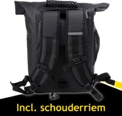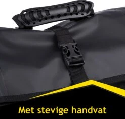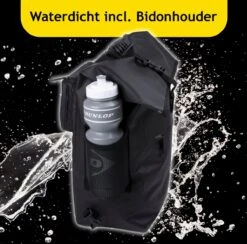 De fietsrugzak heeft een inhoud van 25 liter en is gemaakt van een waterdichte stof zodat jouw spullen ook bij slechter weer goed beschermd blijven in de Dunlop fietstas. De opening van de tas zit aan de bovenkant die je afsluit doormiddel van een rol topafdichtig, hierdoor zal er geen water in de tas lekken wanneer het regent. Je sluit de rugzak veilig af met een gespafsluiting.