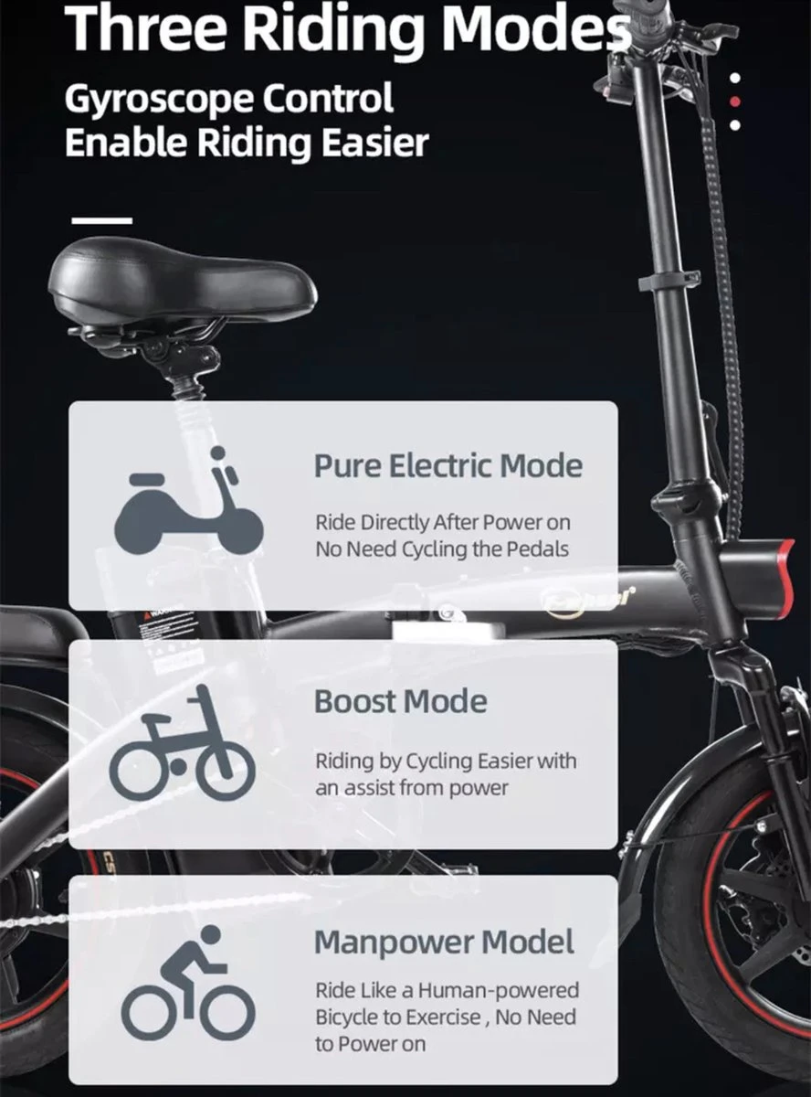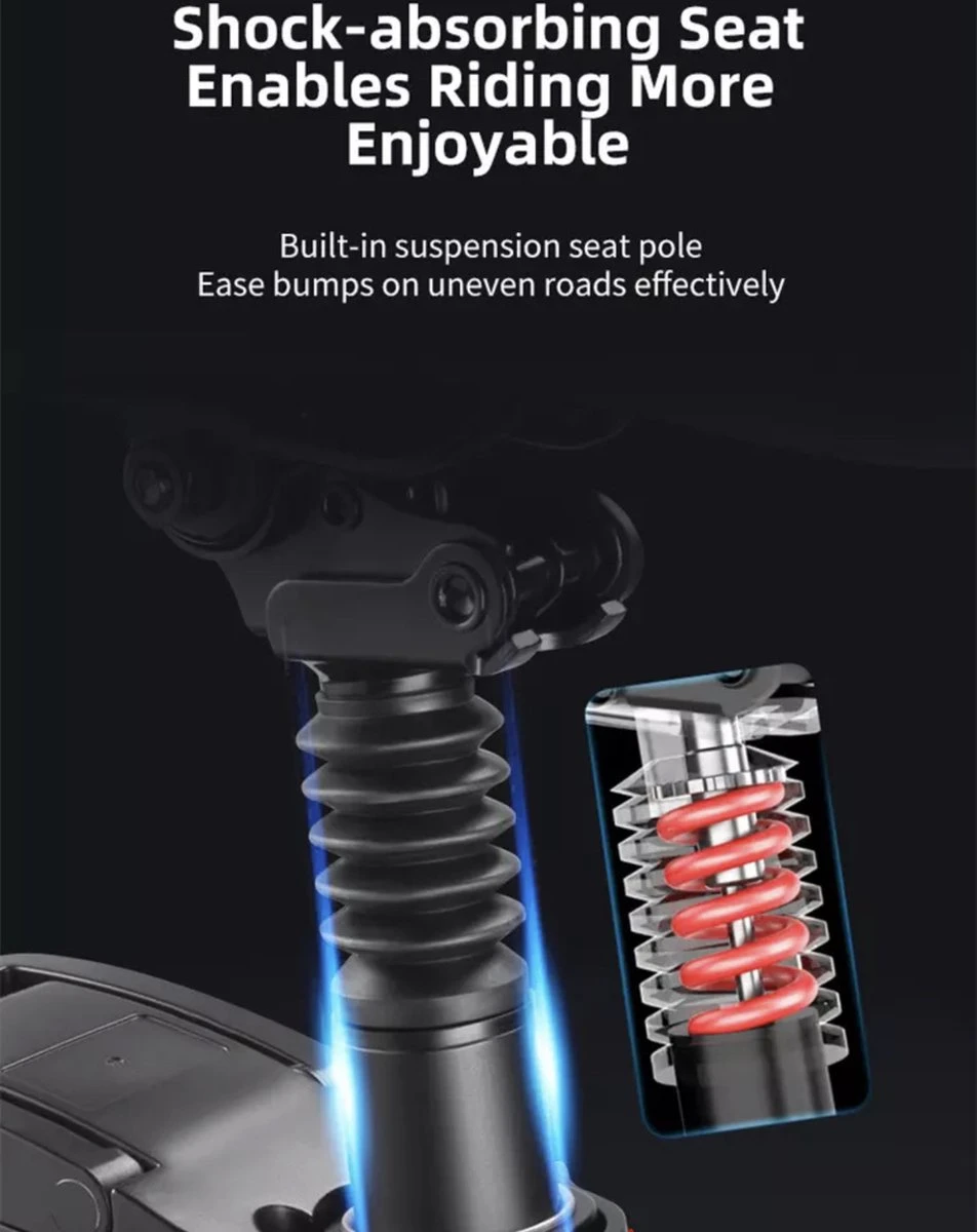 De A5 heeft ook een comfortabele schokabsorberende stoel en schokdempers aan de voorkant voor een soepele, comfortabele rit. De A5 is de enige DYU elektrische fiets met 3-traps vouwmogelijkheid door de stoel te laten zakken, het stuur om te vouwen en vervolgens de fiets letterlijk dubbel te vouwen! Dit geeft u een ultracompacte opslag voor lange afstanden in een auto of opslag in huis/kantoor.
