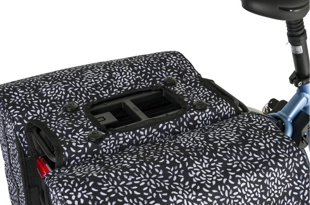 Met zijn speelse uiterlijk en afgeronde hoeken is de Nyla dubbele fietstas ideaal voor diegenen die op zoek zijn naar een opvallende maar veelzijdige fietstas die gemakkelijk aan de fiets kan worden bevestigd door middel van riempjes, maar is ook te gebruiken in combinatie met het MIK systeem. Gemaakt van gerecycled polyester als onderdeel van ons RETHINK-programma, de waterafstotende stof is voorzien van reflecterende elementen om de zichtbaarheid te verbeteren.