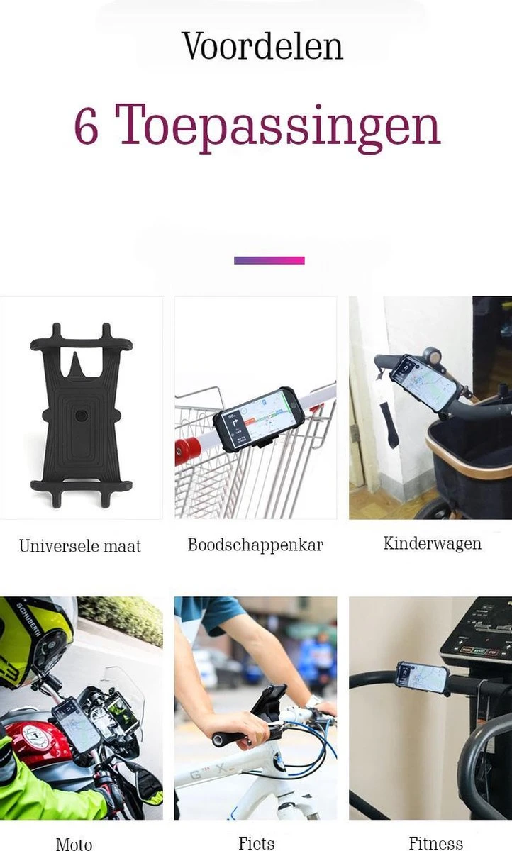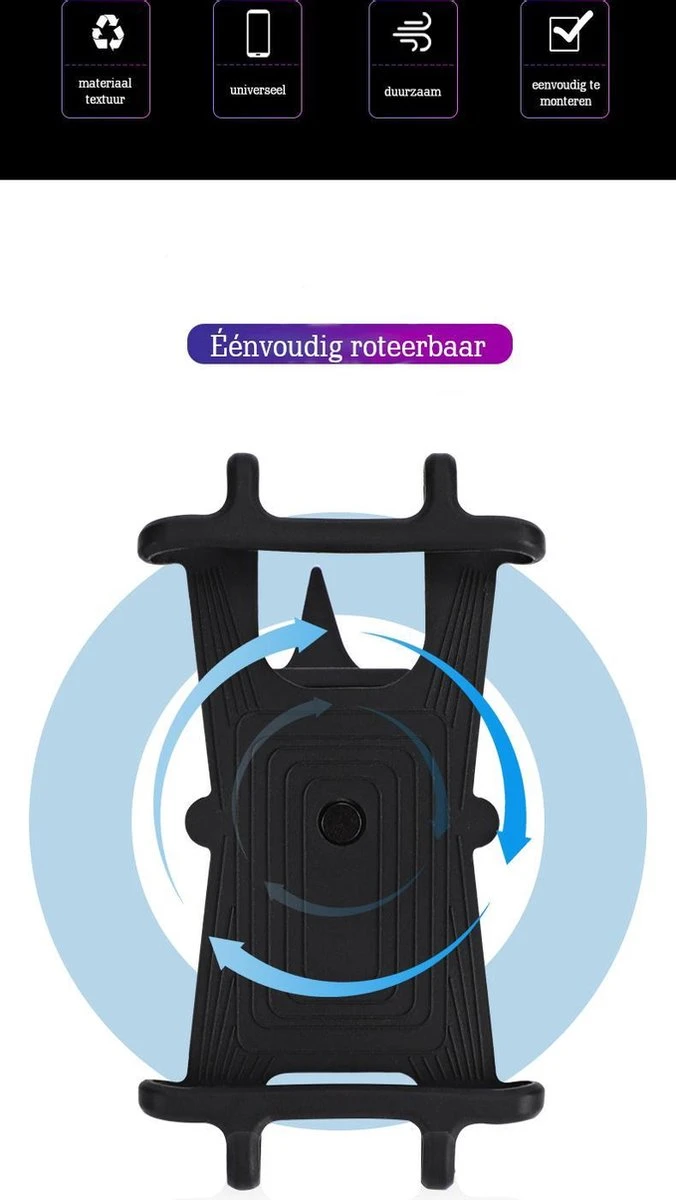 De Smartphone-houder voor op de fiets, kinderwagen, motor of winkelkar is ideaal om ongelukken of bekeuringen te vermijden! Geschikt voor Smartphones van 4″tot 7″. Hiermee zul je veilig en gemakkelijk de weg op gaan. Of je nou met de fiets bent, motor of kinderwagen. Daarbij is de Telefoon Houder van stretchbare siliconen materiaal die jou telefoon ook nog eens beschermt in het geval van vallen.