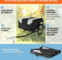 De fiets-aanhanger Mountee van DURAMAXX is uw specialist als het gaat om het verplaatsen van grote ladingen met de fiets – naar de supermarkt, op de weg in de tuin, naar de volgende picknick of zelfs een grotere fietstocht. De 130-liter grote laadruimte zorgt ervoor dat er heel wat bagae worden meegenomen. Daarvoor zorgt het stabiele stalen buizenframe. Geen vervelende autoritten meer want voor korte transportafstanden gebruikt u nu de DURAMAXX Mountee fiets-aanhanger: Om uzelf te redden van de stressvolle zoektocht naar een parkeerplaats, verkeersopstoppingen te verminderen en uw conditie te verbeteren. De lading wordt met een nylonhoes die over het frame gespannen in geval van regen.