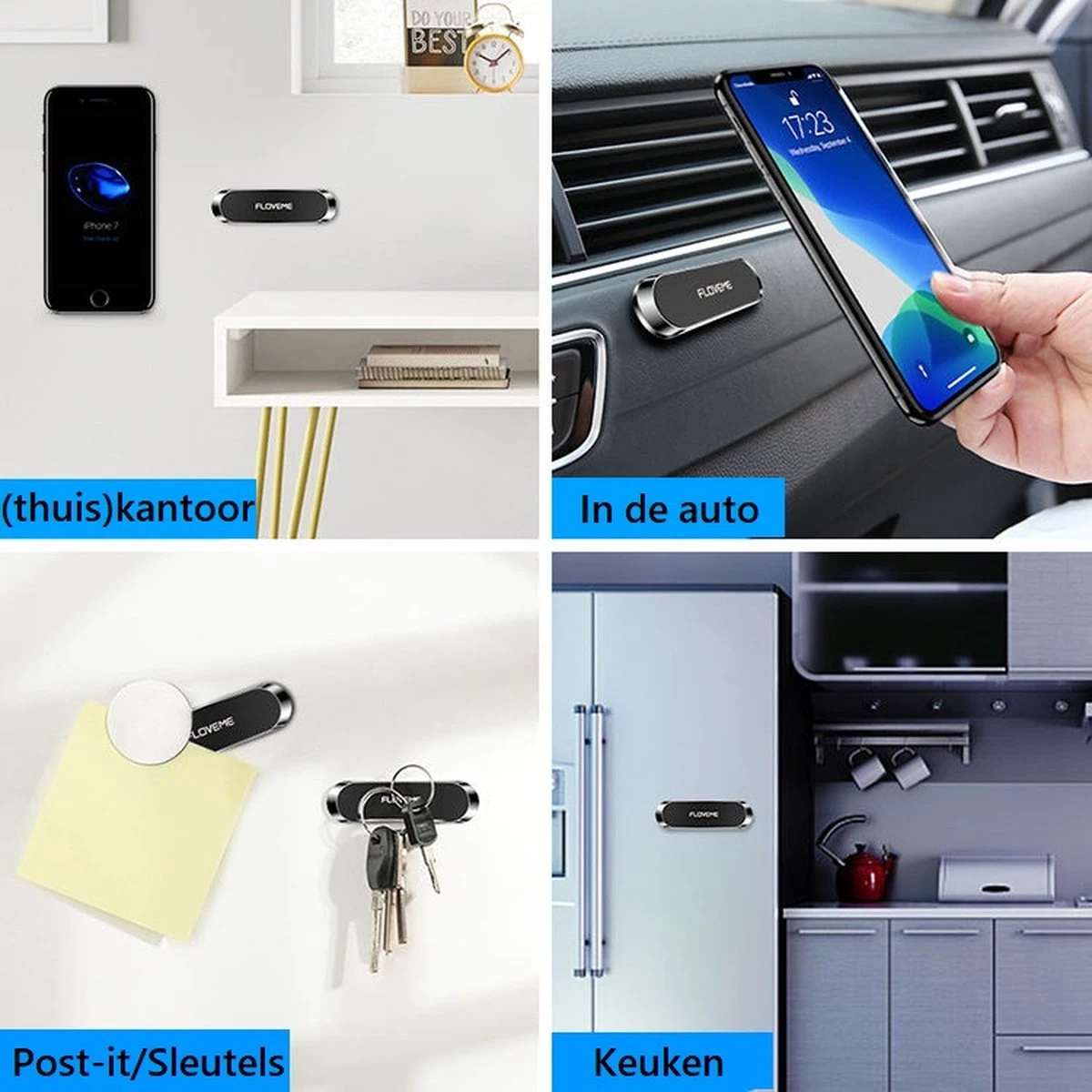 Zijn jij en je smartphone onafscheidelijk? Ervaar jij ook dat je geen moment afstand van kan nemen? Dan is deze multifunctionele magneet houder van Lennexo de ideale gadget voor jou! Jij bepaalt waar je de houder geplaatst wilt hebben. Of dat in de keuken is, in de auto of simpelweg bij je bureau op kantoor. Dankzij de eenvoudige installatie middels een plakzijde is er geen behoefte meer om zware gereedschap te gebruiken. De meegeleverde metalen platen zijn te gebruiken met en zonder telefoonhoesje. Plaats deze op de achterzijde van je smartphone of hoesje, en je bent klaar!