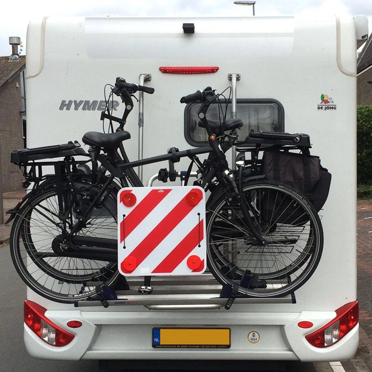 De afmetingen van dit markeringsbord zijn 500 x 500 mm (lengte x breedte). Dit bord is geschikt voor het markeren van uitstekende delen. U kunt hier bijvoorbeeld denken aan de fietsen achterop uw caravan of camper.
