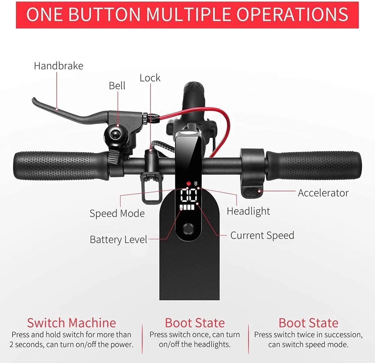 - Single press. Long press to shut down. When electric Scooter is on, a short single press will switch headlights on/off.